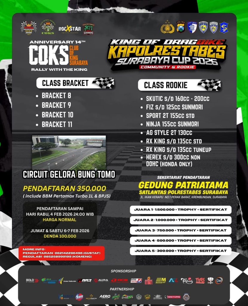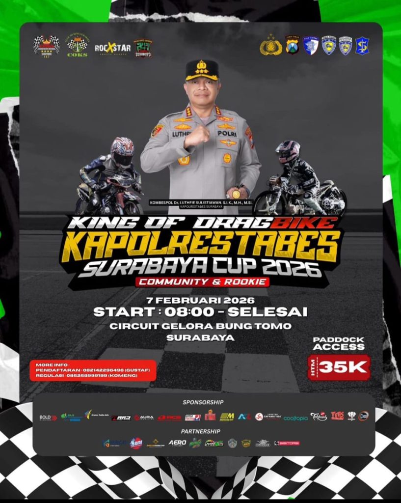 Dalam ajang King of Drag Bike Kapolrestabes Surabaya Cup 2026 ini, Kapolrestabes Surabaya Kombes Pol Lutfiie Setiawan, S.I.K, M.H, M.Si, mengatakan, Selasa (03/02/2025), ajang kompetisi balap motor lintasan lurus (biasanya 201 meter) yang bertujuan mewadahi hobi kecepatan di sirkuit resmi.