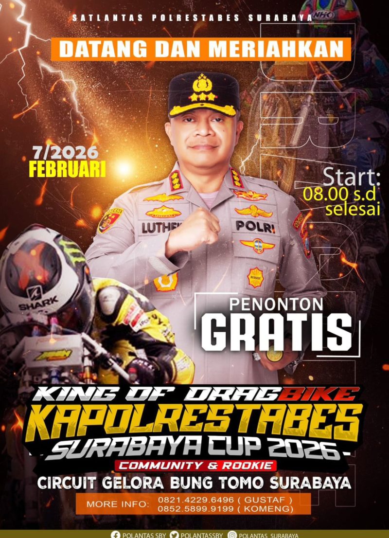 Dalam ajang King of Drag Bike Kapolrestabes Surabaya Cup 2026 ini, Kapolrestabes Surabaya Kombes Pol Lutfiie Setiawan, S.I.K, M.H, M.Si, mengatakan, Selasa (03/02/2025), ajang kompetisi balap motor lintasan lurus (biasanya 201 meter) yang bertujuan mewadahi hobi kecepatan di sirkuit resmi.