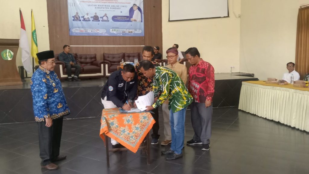 SUMENEP Suksesi-Indonesia.com-Pada momentum kegiatan seminar jurnalistik dengan tema “hukum dan kebebasan Pers, perlindungan jurnalis di tengah tekanan dan tuntutan publik”, yang digelar Pengurus Daerah (PD) Ikatan Wartawan Online (IWO) Sumenep bekerja sama dengan Universitas PGRI (UPI) Sumenep, sekaligus juga dilakukan penandatanganan Memories Of Understanding (MOU) Antara IWO dan UPI Sumenep, disaksikan Wakil Bupati Sumenep KH Imam Hasyim, bertempat di Gedung Pertemuan UPI Sumenep, Kamis (27/11/2025).