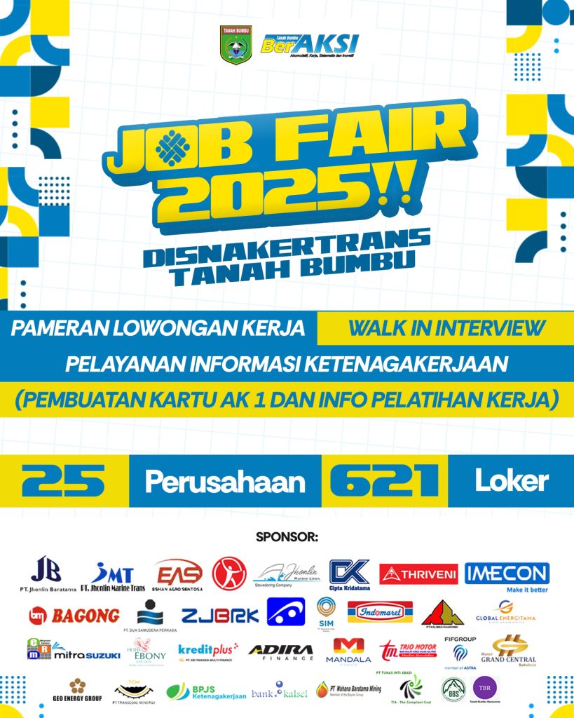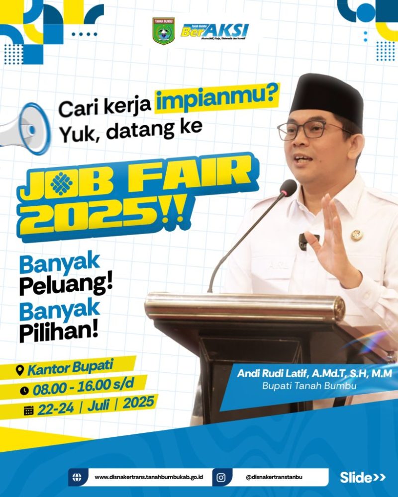 – Pemerintah Kabupaten Tanah Bumbu kembali menunjukkan komitmennya terhadap peningkatan kesejahteraan masyarakat melalui pelaksanaan Job Fair 2025 yang digelar selama tiga hari, 22–24 Juli 2025, bertempat di Halaman Kantor Bupati Tanah Bumbu, mulai pukul 08.00 hingga 16.00 WITA.