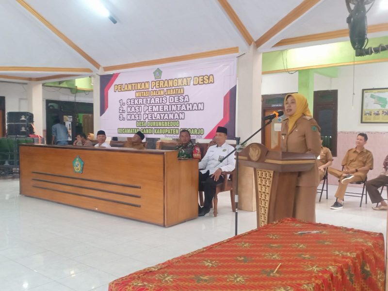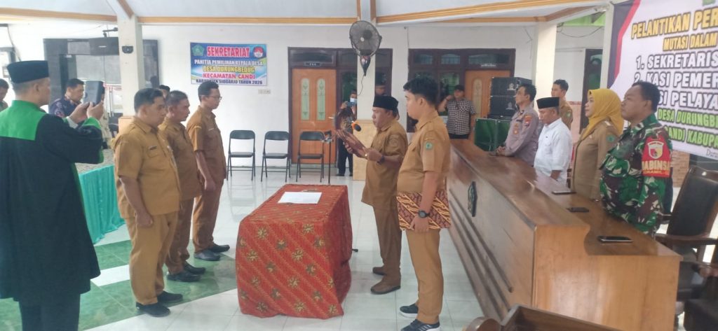 SIDOARJO Suksesi Indonesia.com- Pemerintah Desa (Pemdes) Durung Bedug Kecamatan Candi menggelar pelantikan dan Mustasi perangkat desa baru , Senin ( 23 Februari 2026 ) di Pendopo Balai Desa setempat.