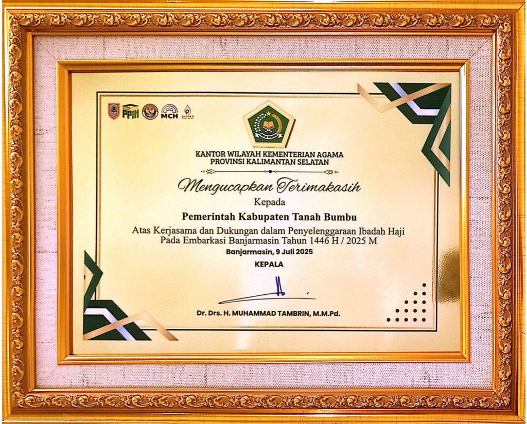 Piagam penghargaan tersebut diserahkan Kepala Kantor Wilayah Kementerian Agama Provinsi Kalimantan Selatan atas kerjasama dan dukungan Pemkab Tanah Bumbu dalam penyelenggaraan ibadah haji pada Embarkasi Banjarmasin Tahun 2025.