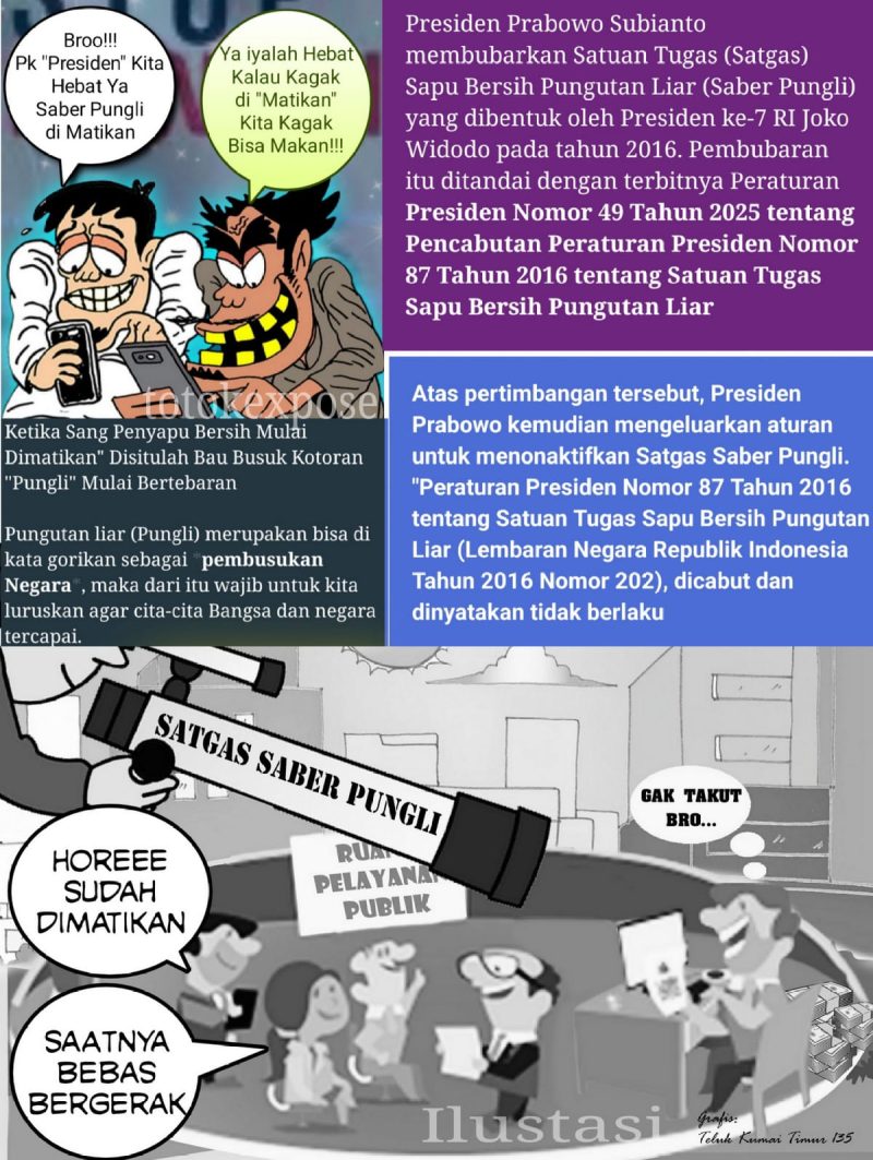 Ironi” di tahun 2025 dalam kepemimpinan Presiden Probowo Subianto melakukan pembubaran Satuan Tugas (Satgas) Sapu Bersih Pungutan Liar (Saber Pungli) merupakan bukti agin segar para Oknum-oknum petugas pelayan publik untuk melakukan Pungli secsra masif dan terstruktur, tak peduli pangkat yang disandang sebagai taruhanya “(pangkat Kopral penghasilan Jendral)”.
