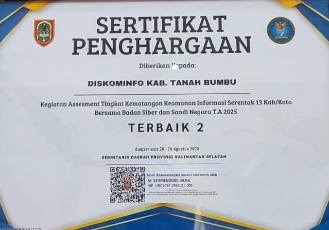 BATULICIN – Pemerintah Kabupaten Tanah Bumbu melalui Dinas Komunikasi Informatika Statistik dan Persandian (Diskominfosp) berhasil meraih peringkat terbaik kedua dalam penilaian tingkat kematangan keamanan informasi dari 13 kabupaten/kota se-Kalimantan Selatan. Penilaian ini dilakukan oleh Badan Siber dan Sandi Negara (BSSN) pada 28–29 Agustus 2025 di Banjarmasin.