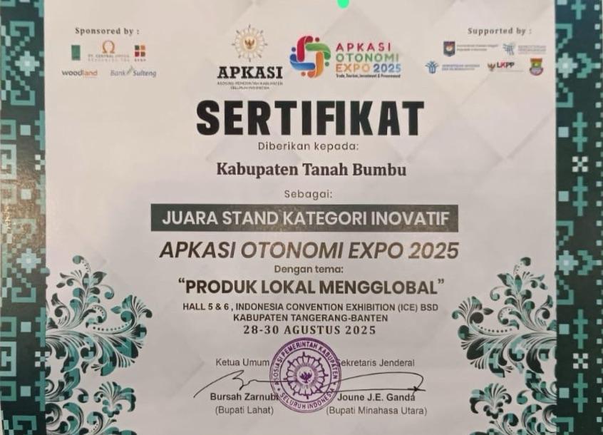 BATULICIN – Kabupaten Tanah Bumbu menerima penghargaan Stand Kategori Inovatif pada gelaran Apkasi Otonomi Expo (AOE) 2025, 28-30 Agustus 2025 di Indonesia Convention Exhibition (ICE) BSD, Tangerang.